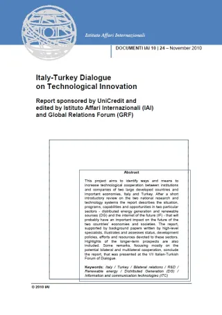 This project aims to identify ways and means to increase technological cooperation between institutions and companies of two large developed countries and important economies, Italy and Turkey. After a short introductory review on the two national research and technology systems the report describes the situation, programs, capabilities and opportunities in two particular sectors - distributed energy generation and renewable sources (DG) and the internet of the future (IF) - that will probably have an important impact on the future of the two countries’ economies and societies. Both sectors have similar interesting characteristics (development based on existing technologies accompanied by strong research programs, very high “pervasiveness”, big growth expectations based on new potential applications) and are crucial for the development of small, dispersed communities typical of both countries. The report, supported by background papers written by high-level specialists, illustrates and assesses status, development policies, efforts and resources devoted to these sectors. Highlights of the longer-term prospects are also included. Some remarks, focusing mostly on the potential bilateral and multilateral cooperation, conclude the report.