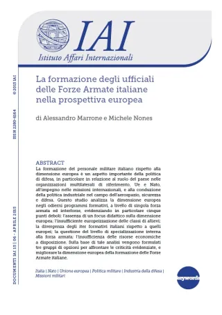 La dimensione europea della formazione del personale militare italiano è un aspetto importante della politica di difesa, in particolare per il ruolo del paese nelle organizzazioni multilaterali di riferimento (Ue e Nato), il suo impegno nelle missioni internazionali, e la politica industriale nel campo dell'aerospazio, sicurezza e difesa. Questo studio analizza il ruolo della dimensione europea negli odierni programmi formativi, a livello di singola forza armata ed interforze, evidenziando in particolare cinque punti deboli: l'assenza di un focus didattico sulla dimensione europea; l'insufficiente europeizzazione delle classi di allievi; la divergenza degli iter formativi italiani rispetto a quelli europei; il livello di specializzazione interna alla forza armata; l'insufficienza delle risorse economiche a disposizione. Sulla base di tale analisi vengono formulati tre gruppi di opzioni per affrontare le criticità evidenziate, e migliorare la dimensione europea della formazione delle Forze Armate italiane.