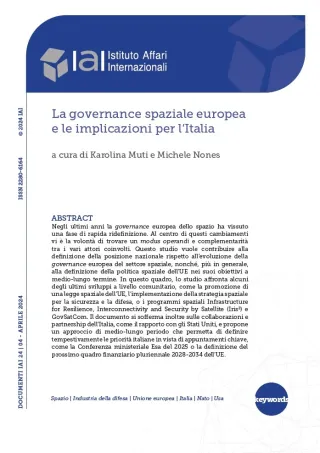 Negli ultimi anni la governance europea dello spazio ha vissuto una fase di rapida ridefinizione. Al centro di questi cambiamenti vi è la volontà di trovare un modus operandi e complementarità tra i vari attori coinvolti. Questo studio vuole contribuire alla definizione della posizione nazionale rispetto all’evoluzione della governance europea del settore spaziale, nonché, più in generale, alla definizione della politica spaziale dell’UE nei suoi obiettivi a medio-lungo termine. In questo quadro, lo studio affronta alcuni degli ultimi sviluppi a livello comunitario, come la promozione di una legge spaziale dell’UE, l’implementazione della strategia spaziale per la sicurezza e la difesa, o i programmi spaziali Iris2 e GovSatCom. Il documento si sofferma inoltre sulle collaborazioni e partnership dell’Italia, come il rapporto con gli Stati Uniti, e propone un approccio di medio-lungo periodo che permetta di definire tempestivamente le priorità italiane in vista di appuntamenti chiave, come la Conferenza ministeriale Esa del 2025 o la definizione del prossimo quadro finanziario pluriennale 2028-2034 dell’UE.