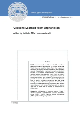 NATO members such as Italy and the UK have been heavily engaged in Afghanistan for almost a decade. Useful lessons could be drawn from this experience regarding the political, military, diplomatic and economic aspects of stabilization missions in complex and volatile theatres in Europe’s neighbourhood. To understand spoiling factors, to engage the “home front”, to prepare for worst-case scenarios and asymmetric warfare, to coordinate civilians and militaries at home and on the ground, to connect the defence industry with the front line, to build a long-term partnership with the target country, to make the peace process as inclusive as possible, to balance economic competition with political cooperation, are only some of the lessons to be learned and kept in mind after a decade of engagement in Afghanistan.