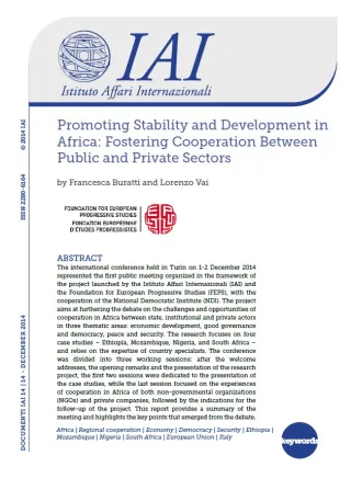 Rapporto della conferenza internazionale "Promoting Stability and Development in Africa: Fostering Cooperation Between Public and Private Sectors", organizzata a Torino in data 1-2 dicembre 2014 - nell'ambito dell'omonimo progetto - dall'Istituto Affari Internazionali (IAI) e dalla Foundation for European Progressive Studies (FEPS) in cooperazione con il Centro Piemontese di Studi Africani (CSA), con il sostegno del Ministero degli Affari esteri, di Eni e della Compagnia di San Paolo e con il patrocinio del Comune di Torino.