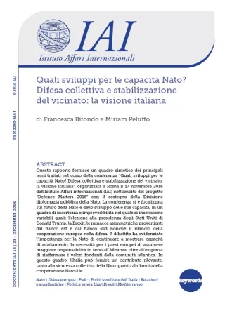 Questo rapporto fornisce un quadro sintetico dei principali temi trattati nel corso della conferenza “Quali sviluppi per le capacità Nato? Difesa collettiva e stabilizzazione del vicinato: la visione italiana”, organizzata a Roma il 17 novembre 2016 dall’Istituto Affari internazionali (IAI) nell'ambito del progetto “Defence Matters 2016” con il sostegno della Divisione Diplomazia pubblica della Nato. La conferenza si è focalizzata sul futuro della Nato e dello sviluppo delle sue capacità, in un quadro di incertezza e imprevedibilità nel quale si inseriscono variabili quali: l’elezione alla presidenza degli Stati Uniti di Donald Trump, la Brexit, le minacce asimmetriche provenienti dal fianco est e dal fianco sud nonché il rilancio della cooperazione europea nella difesa. Il dibattito ha evidenziato l’importanza per la Nato di continuare a mostrare capacità di adattamento, la necessità per i paesi europei di assumere maggiore responsabilità in seno all’Alleanza, oltre all’esigenza di riaffermare i valori fondanti della comunità atlantica. In questo quadro, l’Italia può fornire un contributo rilevante, tanto alla sicurezza collettiva della Nato quanto al rilancio della cooperazione Nato-Ue.