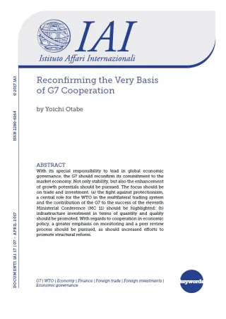 Il G7, con la sua speciale responsabilità nella guida della governance economica mondiale, dovrebbe riconfermare il proprio impegno per un’economia di mercato. Non va ricercata solo la stabilità ma bisogna anche rafforzare la crescita. L’attenzione va quindi al commercio e agli investimenti: (a) si sottolinea l’importanza di contrastare il protezionismo, nonché di un ruolo centrale per l’OMC nel sistema commerciale multilaterale e del contributo del G7 per il successo dell’undicesima conferenza ministeriale; (b) si auspica vengano promossi, in termini di quantità e qualità, gli investimenti in infrastrutture. Quanto alla cooperazione in materia di politica economica, va posta maggiore enfasi sul controllo e su un processo di revisione tra pari, così come bisogna intensificare gli sforzi per promuovere una riforma strutturale.