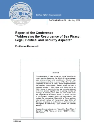 The resurgence of sea piracy has made headlines in recent months, becoming the object of intense debate, also among scholars and practitioners. Attention has concentrated particularly on piracy off the Horn of Africa (especially in the Gulf of Aden), where the phenomenon has reached critical levels. Reports speak of over a hundred attacks in 2008 alone and rising figures in 2009. Some 18 merchant ships are currently detained by Somali pirates together with a growing number of hostages. Ransoms paid in 2008 are estimated to be in the range of over a hundred million US dollars. In view of the growing concern about the phenomenon, the Institute for International Affairs (IAI) of Rome and the International Institute of Humanitarian Law (IIHL) of Sanremo organized a conference on ‘Addressing the Resurgence of Sea Piracy: Legal, Political and Security Aspects’.