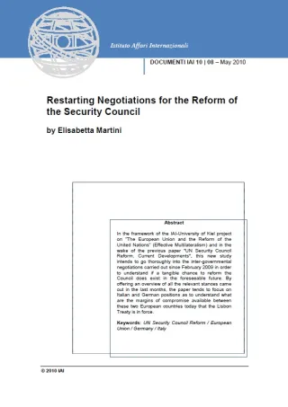 In the framework of the IAI-University of Kiel project on “The European Union and the Reform of the United Nations” (Effective Multilateralism) and in the wake of the previous paper "UN Security Council Reform. Current Developments", this new study intends to go thoroughly into the inter-governmental negotiations carried out since February 2009 in order to understand if a tangible chance to reform the Council does exist in the foreseeable future. By offering an overview of all the relevant stances came out in the last months, the paper tends to focus on Italian and German positions as to understand what are the margins of compromise available between these two European countries today that the Lisbon Treaty is in force.