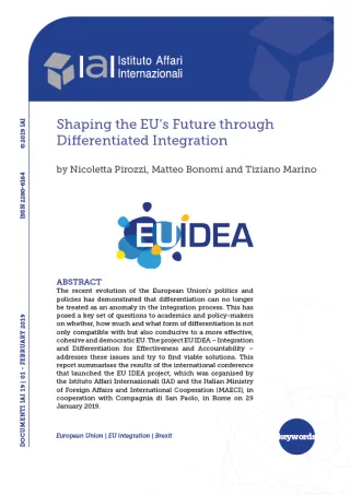 L’evoluzione recente della politica e delle politiche dell’Unione europea ha dimostrato che la differenziazione non può più essere considerata come un’anomalia nel processo di integrazione. Da ciò deriva una serie di domande cruciali per gli accademici e i decisori politici su se, quanto e in che forma la differenziazione sia non solo compatibile, ma anche favorevole a un’Unione più efficace, coesa e democratica. Il progetto EU IDEA affronta queste tematiche e cerca di trovare delle risposte. Questo rapporto riassume i risultati della conferenza internazionale di lancio del progetto EU IDEA, organizzata a Roma il 29 gennaio 2019 dall’Istituto Affari Internazionali e dal Ministero degli Affari esteri e della Cooperazione internazionale in collaborazione con la Compagnia di San Paolo.