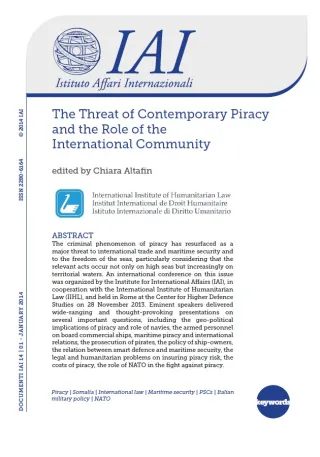 Rapporto della conferenza internazionale su "The Threat of Contemporary Piracy and the Role of the International Community", organizzata a Roma il 28 novembre 2013 dall'Istituto Affari Internazionali (IAI) in collaborazione con International Institute of Humanitarian Law (IIHL).