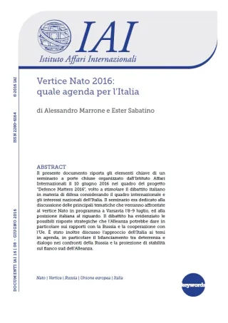 Il presente documento riporta gli elementi chiave di un seminario a porte chiuse organizzato dall’Istituto Affari Internazionali il 10 giugno 2016 nel quadro del progetto “Defence Matters 2016”, volto a stimolare il dibattito italiano in materia di difesa considerando il quadro internazionale e gli interessi nazionali dell’Italia. Il seminario era dedicato alla discussione delle principali tematiche che verranno affrontate al vertice Nato in programma a Varsavia l’8-9 luglio, ed alla posizione italiana al riguardo. Il dibattito ha evidenziato le possibili risposte strategiche che l’Alleanza potrebbe dare in particolare sui rapporti con la Russia e la cooperazione con l’Ue. È stato inoltre discusso l’approccio dell’Italia ai temi in agenda, in particolare il bilanciamento tra deterrenza e dialogo nei confronti della Russia e la proiezione di stabilità sul fianco sud dell’Alleanza.
