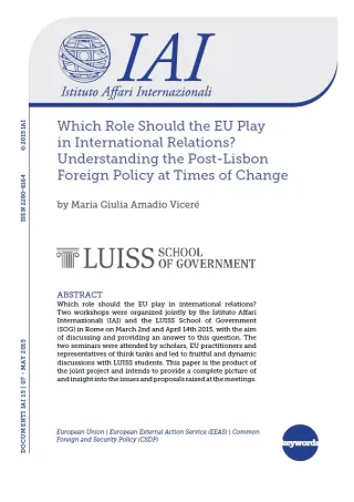 Quale ruolo dovrebbe svolgere l'Unione europea nelle relazioni internazionali? L'Istituto Affari Internazionali (IAI) e la LUISS School of Government (SOG) hanno organizzato a Roma due seminari – il 2 marzo e 14 aprile 2015 – con l'obiettivo di discutere l’argomento e dare una risposta a questa domanda. Dai due seminari, cui hanno partecipato studiosi, esperti dell'Ue e rappresentanti di think tank, è scaturita una discussione vivace costruttiva con gli studenti della LUISS. Il presente rapporto intende fornire un quadro completo e approfondito dei temi trattati – e delle proposte avanzate – in questi due incontri.