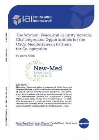 Questo documento, preparato nell’ambito della rete di ricerca New-Med, intende esaminare a 17 anni dalla sua adozione lo stato di attuazione della Risoluzione 1325 (2000) del Consiglio di Sicurezza delle Nazioni Unite, e relative risoluzioni, nonché il suo potenziale nei sei partner mediterranei dell’Osce – ossia Algeria, Egitto, Israele, Giordania, Marocco e Tunisia. Obiettivo centrale della ricerca è identificare nuove modalità e strumenti per rafforzare il ruolo dell’Osce nel far progredire l’agenda 1325 nella regione mediterranea.