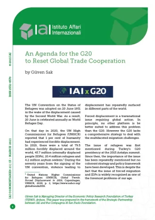 In 2021, during Italy’s presidency of the G20 and at the time of the COVID-19 pandemic, the issue of forcibly displaced people has gained additional urgency for three reasons.
