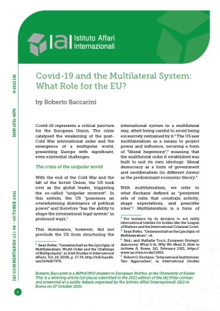 [9] For a general overview, see Alessandro Colombo and Paolo Magri (eds), The World and the Pandemic. Europe’s Hour?, Milan, Ledizioni, March 2021, https://www.ispionline.it/en/node/29455; Claudia Schmucker, “The Effects of the COVID-19 Pandemic on US and European Commitment to the Multilateral Economic Order”, in IAI Papers, No. 20|39 (November 2020), https://www.iai.it/en/node/12403; and David L. Levy, “COVID-19 and Global Governance”, in Journal of Management Studies, Vol. 58, No. 2 (March 2021), p. 562-566, https://doi.org/10.1111/joms.12654.