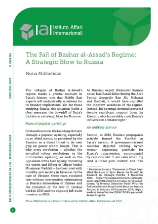 [1] Alexander Baunov, “Damascus in Three Days: What the Loss of Syria Means for Russia” [in Russian], in Carnegie Politika, 9 December 2024, https://carnegieendowment.org/russia-eurasia/politika/2024/12/russia-syria-assad-failure; “‘A Personal Defeat for Putin’. What the Failure to Protect Assad Could Mean for Russia’s Future”, in Meduza, 10 December 2024, https://meduza.io/en/feature/2024/12/10/a-personal-defeat-for-putin.