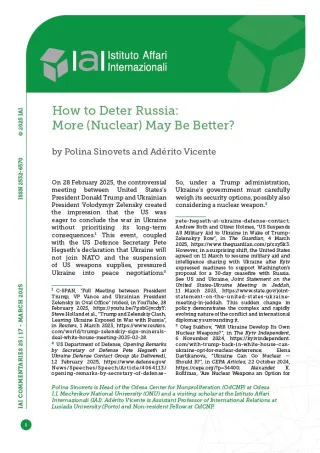 [3] Oleg Sukhov, “Will Ukraine Develop Its Own Nuclear Weapons?”, in The Kyiv Independent, 6 November 2024, https://kyivindependent.com/with-trump-back-in-white-house-can-ukraine-opt-for-nuclear-deterrence; Elena Davlikanova, “Ukraine Can Go Nuclear — Should It?”, in CEPA Articles, 22 October 2024, https://cepa.org/?p=34400; Alexander K. Bollfrass, “Are Nuclear Weapons an Option for Ukraine?”, in IISS Online Analyses, 7 February 2025, https://www.iiss.org/online-analysis/online-analysis/2025/02/are-nuclear-weapons-an-option-for-ukraine; Casey Michel, “Ukraine Now Faces a Nuclear Decision”, in Foreign Policy, 7 November 2024, https://foreignpolicy.com/2024/11/07/ukraine-now-faces-a-nuclear-decision.