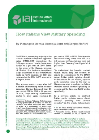 To understand the broader context within which Italy has decided to renew its commitment to the NATO target, Italian public opinion should be factored in. In this respect, opinion polls conducted prior to the war in Ukraine can shed some light on Italian attitudes toward defence spending in general and the 2 per cent NATO pledge specifically.