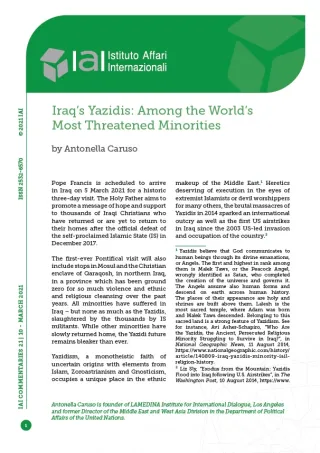 [4] Yazidi population figures vary. See for instance, Peter Henne and Conrad Hackett, “Iraqi Yazidis: Hazy Population Numbers and a History of Persecution”, in Fact Tank, 12 August 2014, https://www.pewresearch.org/?p=262316; Otmar Oehring, Christians And Yazidis in Iraq: Current Situation and Prospects, Sankt Augustin/Berlin, Konrad-Adenauer-Stiftung, 2017, https://d-nb.info/1141052792/34; Nisan Ahmado, “Tracking Missing Yazidis Increasingly Harder Six Years After IS Genocide”, in VOA News, 8 August 2020, https://www.voanews.com/extremism-watch/tracking-missing-yazidis-increasingly-harder-six-years-after-genocide.
