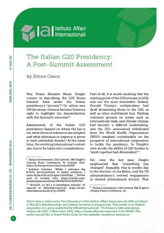 Ettore Greco is Executive Vice-President of the Istituto Affari Internazionali (IAI) and Head of the IAI’s Multilateralism and Global Governance programme. This article is an English adaptation of a piece published by AffarInternazionali: “Un bilancio della presidenza italiana del G20”, 3 November 2021, https://www.affarinternazionali.it/?p=90148. The author would like to thank Yeshe Carta for her valuable translation assistance.