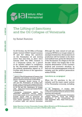 [4] Rafael Ramírez, “The Venezuelan Oil Industry Collapse: Economic, Social and Political Implications”, in IAI Commentaries, No. 21|52 (November 2021), https://www.iai.it/en/node/14308.