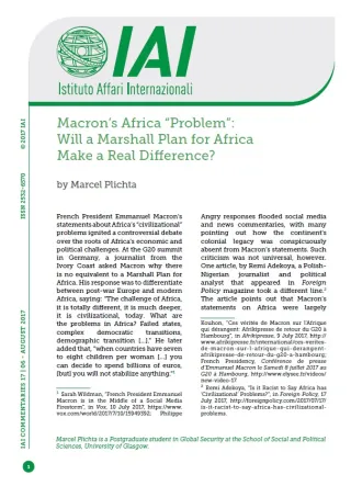 [1] Sarah Wildman, “French President Emmanuel Macron is in the Middle of a Social Media Firestorm”, in Vox, 10 July 2017, https://www.vox.com/world/2017/7/10/15949392; Philippe Kouhon, “Ces vérités de Macron sur l’Afrique qui dérangent: Afrikipresse de retour du G20 à Hambourg”, in Afrikipresse, 9 July 2017, http://www.afrikipresse.fr/international/ces-verites-de-macron-sur-l-afrique-qui-derangent-afrikipresse-de-retour-du-g20-a-hambourg; French Presidency, Conférence de presse d'Emmanuel Macron le Samedi 8 juillet 2017 au G20 à Hambourg, http://www.elysee.fr/videos/new-video-17.