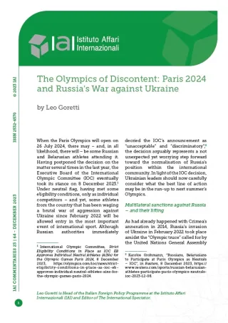 [4] Leo Goretti, “The Sporting Sanctions against Russia: Debunking the Myth of Sport’s Neutrality”, in IAI Papers, No. 22|09 (May 2022), https://www.iai.it/en/node/15324.