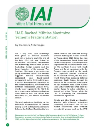 [1] Aziz El Yaakoubi, “UAE Builds Up Yemen Regional Army But Country Fragments”, in Reuters, 3 May 2017, http://reut.rs/2p4ntRl.