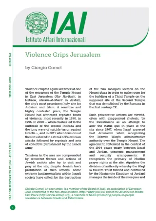 Violence erupted again last week at one of the entrances of the Temple Mount in East Jerusalem (Har Ha-Bayit, in Hebrew, Haram-al-Sharif in Arabic), the city’s most prominent holy site for Judaism and Islam. A sensitive and highly contested place, the Temple Mount has witnessed repeated bouts of violence; most recently in 1990, in 1996, in 2000 – when clashes led to the outbreak of the second Intifada and the long wave of suicide terror against Israelis –, and in 2015 when tensions at the site ushered in a streak of Palestinian attacks followed by reprisals and acts of collective punishment by the Israeli army.