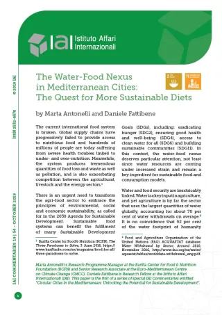 Acknowledging the nexus between food and water in cites is essential to launch a transition towards more sustainable societies. Research on environmental sustainability is scarce, however, and policy-makers and stakeholders do not have access to tools that assess the sustainability of current food consumption patterns. The challenge is to develop innovative tools that local governments can use to measure the impact and costs of current development patterns, helping mayors and municipalities adopt policies that allow economic development as well as healthy food and water ecosystems co-exist and re-enforce each other. Mediterranean countries also need to address the nutritional transition and to actively promote education and awareness campaigns on the benefits of the Mediterranean diet, one of the healthiest and most sustainable in the world and one whose preservation may also serve to re-launch cooperation and interdependence between northern and southern shores of the Mediterranean.