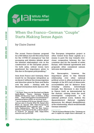 The recent Franco-German proposal for a 500 billion euro EU Recovery Fund for the COVID-19 emergency[1] has fed unceasing and divisive debates about the bilateral relationship’s role in the construction of the European project. On both sides, critical voices have questioned the importance given to this duo in European policymaking.[2]