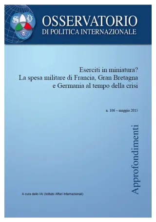 Questo documento propone un'analisi comparativa delle spese per la difesa di Francia, Gran Bretagna e Germania, i tre paesi europei più simili all'Italia per "taglia", ruolo e ambizioni internazionali. I budget della difesa sono esaminati sia dal punto di vista quantitativo – evidenziandone l’andamento negli ultimi anni e quello prevedibile nel futuro – ma anche qualitativo, con particolare attenzione per il bilanciamento tra le varie componenti della spesa e l'adeguatezza rispetto al livello di ambizione militare che sono chiamati a soddisfare. L'analisi effettuata consente di affermare che i paesi in esame rischiano di costituire "eserciti in miniatura": forze armate modernamente equipaggiate ma troppo piccole, in grado di esprimere una gamma completa di capacità militari solo in misura talmente limitata, dal punto di vista quantitativo, da essere scarsamente utilizzabili. Questo rischio deriva, in sostanza, dal tentativo di "fare troppo con troppo poco", cioè di continuare a mantenere un livello di ambizione fuori scala rispetto alle risorse messe effettivamente a disposizione per le Forze armate.