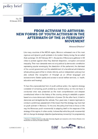 Like many countries of the MENA region, Morocco has witnessed one of the most vigorous and dynamic youth protest in its modern history during the so-called Arab uprisings. To face this unprecedented form of youth political action, the strategy of the State consisted in containing youth protest by a twofold policy: conducting constitutional reform and trying to de-legitimize the radicals. The Policy Brief analyses what impact this strategy may have had on youth activism in Morocco. It focuses on the way the Moroccan youth movement(s) is adapting to the response of the regime. In this regard, it shows that while the youth movement(s) did not change its strategic objective (parliamentary monarchy) it is progressively changing the means to achieve it.