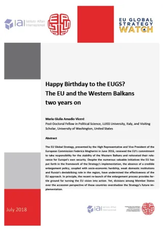 The EU Global Strategy, presented by the High Representative and Vice President of the European Commission Federica Mogherini in June 2016, renewed the EU’s commitment to take responsibility for the stability of the Western Balkans and reiterated their rele- vance for Europe’s own security. Despite the numerous valuable initiatives the EU has put forth in the framework of the Strategy’s implementation, the absence of a credible enlargement policy, coupled with socio-economic hardship, weak domestic institutions and Russia’s destabilizing role in the region, have undermined the effectiveness of the EU approach. In principle, the recent re-launch of the enlargement process provides fer- tile ground for turning the EU vision into action. Yet, divisions among Member States over the accession perspective of these countries overshadow the Strategy’s future implementation.