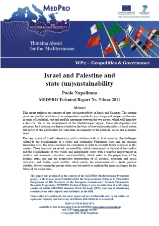 This report explores the concept of state (un)sustainability in Israel and Palestine. The starting point sees conflict resolution as an independent variable for any change and progress in the area, in terms of a political, just and credible agreement between the two parties, which will then play a decisive role in the development of the Mediterranean region. These developments and prospects for a solution are then evaluated on the basis of state (un)sustainability, a broad notion that refers to the possibilities for long-term development at the political, social and economic levels. The very nature of Israel’s democracy and its relations with its Arab minority, the challenges related to the establishment of a viable and sustainable Palestinian state, and the regional dimension of all the actors involved are considered in order to evaluate future scenarios in this context. Three scenarios are tested: sustainability, which corresponds to the end of the conflict and the establishment of two viable and independent states with a tangible improvement in political and economic indicators; unsustainability, which refers to the perpetration of the political status quo and the progressive deterioration of all political, economic and social indicators; and finally, weak stability, which entails the achievement of a sterile political stability, able to sustain the present status quo but unable to confront the main challenges for the future of the country(ies).