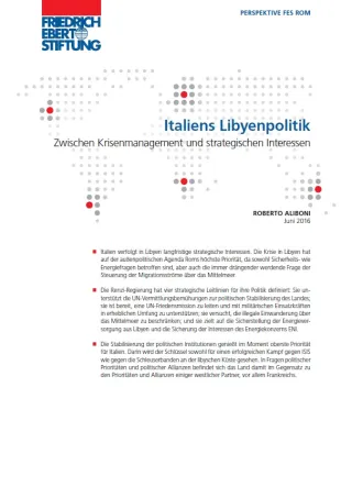 Studio realizzato dall’Istituto Affari Internazionali (IAI) per l’Ufficio di Roma della Fondazione Friedrich-Ebert (FES), giugno 2016. Versione in italiano: La politica libica dell'Italia, Roma, IAI, giugno 2016 (Documenti IAI ; 16|10)