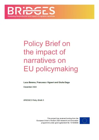 This policy brief looks at the implications of migration narratives for European policymaking. It focuses on the circulation of narratives in the national media and the EU political and policy debates in two key moments: the proposal for a relocation scheme to redistribute asylum seekers among EU Member States in 2015, and the activation of the Temporary Protection Directive for refugees fleeing Ukraine in 2022. After presenting the findings of a research report (D8.1) produced in the framework of the Horizon EU project BRIDGES, this policy brief focuses on translating these findings into policy implications for the EU. The ultimate aim is to draft recommendations for members and officials of European institutions that may contribute to shaping narratives for fairer, comprehensive, and balanced European policy responses to migration and asylum.