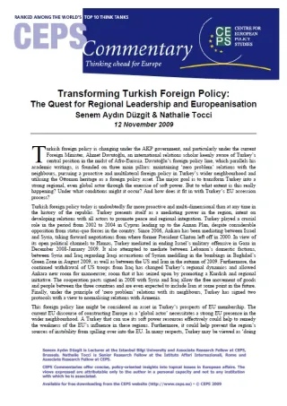 Turkish foreign policy today is far more proactive and multi-dimensional than at any time in the history of the republic. Turkey presents itself as a mediating power in the European neighbourhood, intent on developing relations with all actors in order to promote peace and regional integration. This foreign policy line could be considered as an asset for Turkey’s prospects of EU membership. The current EU discourse of constructing Europe as a ‘global actor’ necessitates a strong EU presence in the wider neighbourhood. A Turkey that can effectively use its soft power resources could significantly help to remedy the weakness of the EU presence in these regions. Furthermore, it could help prevent the region’s sources of instability from spilling over into the EU. In many respects, Turkey may be viewed as ‘doing the European Neighbourhood Policy’ for the EU. Nevertheless, this contribution is dependent on certain conditions. In this new Commentary, Senem Aydın Düzgit (Lecturer at the Istanbul Bilgi University and Associate Research Fellow at CEPS and Nathalie Tocci (Senior Research Fellow at the Istituto Affari Internazionali, Rome and Associate Research Fellow at CEPS) argue for a ‘rational’ debate on Turkey, in the interests of both Turkey’s democratic future and of the EU’s chances of becoming an effective global power in the 21st century.