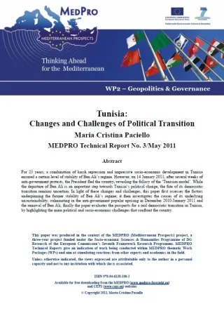 For 23 years, a combination of harsh repression and impressive socio-economic development in Tunisia ensured a certain level of stability of Ben Ali’s regime. However, on 14 January 2011, after several weeks of anti-government protests, the President fled the country, revealing the fallacy of the ‘Tunisian model’. While the departure of Ben Ali is an important step towards Tunisia’s political change, the fate of its democratic transition remains uncertain. In light of these changes and challenges, this paper first assesses the factors underpinning the former stability of Ben Ali’s regime; it then investigates the causes of its underlying unsustainability, culminating in the anti-government popular uprising in December 2010-January 2011 and the removal of Ben Ali; finally the paper evaluates the prospects for a real democratic transition in Tunisia, by highlighting the main political and socio-economic challenges that confront the country.