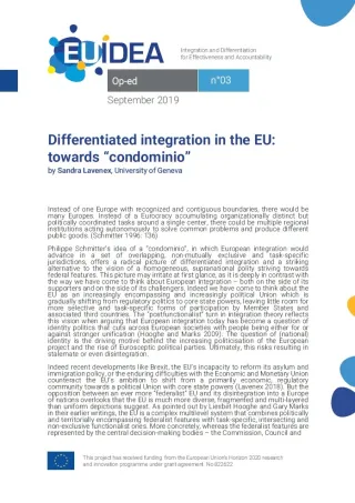 Philippe Schmitter’s idea of a “condominio”, in which European integration would advance in a set of overlapping, non-mutually exclusive and task-specific jurisdictions, offers a radical picture of differentiated integration and a striking alternative to the vision of a homogeneous, supranational polity striving towards federal features. This picture may irritate at first glance, as it is deeply in contrast with the way we have come to think about European integration – both on the side of its supporters and on the side of its challengers. Indeed we have come to think about the EU as an increasingly encompassing and increasingly political Union which is gradually shifting from regulatory politics to core state powers, leaving little room for more selective and task-specific forms of participation by Member States and associated third countries. The “postfunctionalist” turn in integration theory reflects this vision when arguing that European integration today has become a question of identity politics that cuts across European societies with people being either for or against stronger unification (Hooghe and Marks 2009). The question of (national) identity is the driving motive behind the increasing politicisation of the European project and the rise of Eurosceptic political parties. Ultimately, this risks resulting in stalemate or even disintegration.