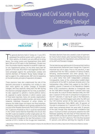 Nelle elezioni parlamentari che si sono svolte in Turchia il 7 giugno 2015, il Partito per la giustizia e lo sviluppo (Akp) ha vinto 258 seggi su 550, 18 seggi in meno rispetto alla maggioranza semplice necessaria per creare un governo monocolore. L'Akp è stato l'unico perdente di queste elezioni, avendo ottenuto quasi il 9 per cento in meno dei voti rispetto alle elezioni del 2011. La società civile turca ha mostrato di voler resistere al presidente Erdoğan nel suo tentativo di esercitare una sempre maggiore tutela sulla società, percepito come in grado di minare la separazione dei poteri e la governance democratica. Questo saggio illustra le iniziative che varie organizzazioni della società civile hanno intrapreso al fine di scongiurare qualsiasi tipo di broglio elettorale. Discute infine il successo del Partito democratico del popolo (Hdp), che è riuscito a conquistare il consenso di una parte dell'elettorato liberale, nonché dei curdi conservatori - al fine di stabilire una alleanza sociale e politica che raccolga l'eredità delle proteste di Gezi Park.