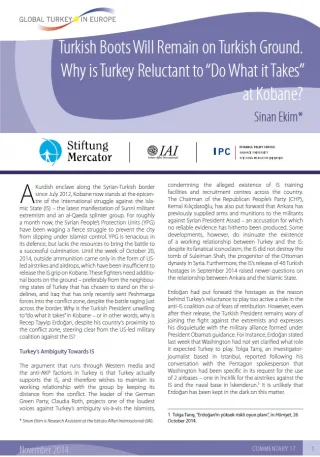 Kobane, dal luglio 2012 una enclave curda al confine tra Siria e Turchia, è ora l'epicentro della lotta internazionale contro lo Stato islamico. Erdogan ha rifiutato di entrare a far parte della coalizione militare contro gli estremisti, guidata dagli Stati Uniti, nonostante forti pressioni nazionali e internazionali. Questo breve saggio sostiene che il conflitto a Kobane rappresenta per Erdogan un'opportunità fuori dagli schemi per risolvere in suo favore la questione dell'indipendenza curda. La Turchia inoltre, preoccupata per le conseguenze dell'intervento militare nel Levante, preferirebbe la creazione di una no-fly zone sulla Siria e di un corridoio umanitario lungo il confine turco-siriano.