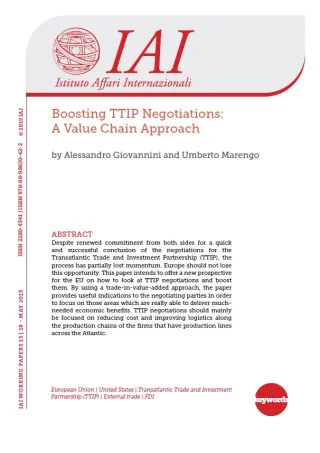 Documento preparato per l'Istituto Affari Internazionali (IAI) e presentato al convegno internazionale "The Geopolitics of the Transatlantic Trade and Investment Partnership", organizzato dallo IAI in collaborazione con Ministero dello sviluppo economico, ITA-Italian Trade Agency e German Marshall Fund of the United States (GMF), Roma, 26 febbraio 2015.