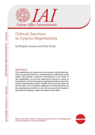 Ancora una volta i negoziati a Cipro si trovano a un punto critico. Il tempo stringe per una soluzione globale sull’isola e l’attuale situazione favorevole non può durare a tempo indeterminato, come si è visto anche nei precedenti cicli negoziali. In realtà i negoziati su Cipro rispecchiano diverse opportunità chiaramente andate perse. Molto tempo prezioso è stato speso in questo processo, e dovrebbe essere evidente per tutti che uscire dai negoziati non porterebbe benefici a nessuno. A questo punto tutti gli attori coinvolti dovrebbero impegnarsi per una rapida conclusione dei colloqui.