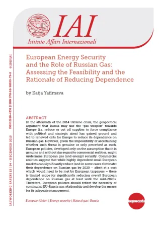 In seguito alla crisi in Ucraina del 2014 la tesi geopolitica che la Russia possa utilizzare il gas come “arma” contro l’Europa (cioè ridurre o tagliare le forniture per costringerla a conformarsi ai suoi obiettivi politici e strategici) ha guadagnato terreno e portato a rinnovati appelli affinché l’Europa riduca la propria dipendenza dal gas russo. Tuttavia è impossibile accertare se tale minaccia sia reale o sia solo percepita come tale. Le politiche europee elaborate unicamente sul presupposto che tale minaccia sia autentica, senza il dovuto riguardo alla realtà del mercato, potrebbero compromettere la sicurezza dell’approvvigionamento di gas in Europa, e in generale la sicurezza energetica europea. La realtà del mercato suggerisce che ridotti mercati europei fortemente dipendenti possono ridurre in modo significativo (e in alcuni casi eliminare) la loro dipendenza dal gas russo entro il 2020 – anche se ad un costo che dovrebbe essere accettato dai contribuenti europei – mentre vi sono scarsi margini per una significativa riduzione della dipendenza dal gas russo di tutta l’Europa, almeno fino alla metà degli anni ‘20. Le politiche europee dovrebbero pertanto riflettere la necessità di continuare l’interscambio di gas tra Ue e Russia, e sviluppare gli strumenti per una sua un’adeguata gestione.