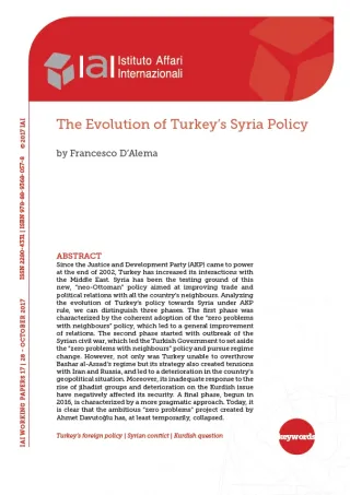 L’interazione della Turchia con il Medio Oriente è aumentata dalla fine del 2002, quando il Partito per la giustizia e lo sviluppo (Akp) è andato al potere. La Siria è stata il banco di prova di questa nuova politica “neo-ottomana”, volta a migliorare le relazioni commerciali e politiche con tutti i paesi vicini. Analizzando l’evolversi della politica della Turchia verso la Siria sotto il governo dell’Akp è possibile distinguere tre fasi. La prima è stata caratterizzata da un’adozione sistematica della politica “zero problemi con i vicini”, che ha portato a un generale miglioramento delle relazioni. L’avvio della seconda fase ha coinciso con l’inizio della guerra civile in Siria, che ha spinto il governo turco ad archiviare la politica “zero problemi con i vicini” e a perseguire un cambio di regime. Tuttavia la Turchia non è stata capace di rovesciare il regime di Bashar al-Assad, e inoltre la sua strategia ha anche creato tensioni con l’Iran e la Russia e ha portato al deteriorarsi della situazione geopolitica del Paese. Ma c’è di più: la sua risposta inadeguata alla crescita dei gruppi jihadisti e il deteriorarsi della questione curda hanno influito negativamente sulla sua sicurezza. La fase finale, iniziata nel 2016, è caratterizzata da un approccio più pragmatico. Oggi l’ambizioso progetto “zero problemi” ideato da Ahmet Davutoğlu sembra arrivato a un perlomeno momentaneo collasso.