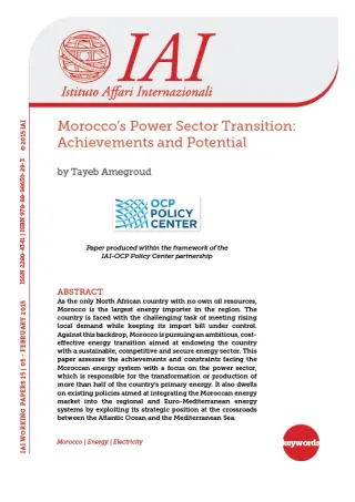 Unico paese del Nord Africa privo di risorse petrolifere, il Marocco è il maggiore importatore di energia nella regione e si trova ad affrontare un compito difficile: soddisfare la crescente domanda interna mantenendo al tempo stesso sotto controllo il costo delle importazioni. Il Marocco sta quindi tentando di realizzare una trasformazione del proprio settore energetico ambiziosa e vantaggiosa dal punto di vista economico, volta a rendere tale settore sostenibile, competitivo e sicuro. Questo studio valuta successi e limiti del sistema energetico del Marocco riservando una particolare attenzione al settore dell'energia elettrica, responsabile della trasformazione/produzione di oltre metà dell'energia del paese. Vengono inoltre considerate le attuali politiche volte a integrare il mercato energetico del Marocco nei sistemi regionali e euromediterranei sfruttando la sua posizione strategica, al crocevia tra Oceano Atlantico e Mediterraneo.