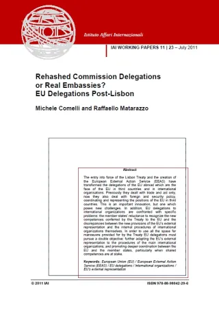 The entry into force of the Lisbon Treaty and the creation of the European External Action Service (EEAS) have transformed the delegations of the EU abroad which are the face of the EU in third countries and in international organisations. Previously they dealt with trade and aid only, now they also deal with foreign and security policy, coordinating and representing the positions of the EU in third countries. This is an important innovation, but one which poses new challenges. In addition, EU delegations to international organizations are confronted with specific problems: the member states’ reluctance to recognize the new competences conferred by the Treaty to the EU and the discrepancies between the new provisions of the EU’s external representation and the internal procedures of international organizations themselves. In order to use all the space for manoeuvre provided for by the Treaty EU delegations must pursue a double objective: further adapting the EU’s external representation to the procedures of the main international organizations; and promoting deeper coordination between the EU and the member states, particularly when shared competences are at stake.