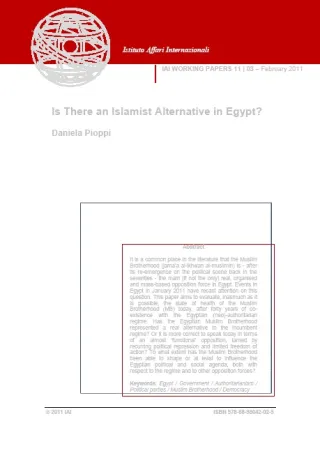 It is a common place in the literature that the Muslim Brotherhood (jama’a al-ikhwan al-muslimin) is - after its re-emergence on the political scene back in the seventies - the main (if not the only) real, organised and mass-based opposition force in Egypt. Events in Egypt in January 2011 have recast attention on this question. This paper aims to evaluate, inasmuch as it is possible, the state of health of the Muslim Brotherhood (MB) today, after forty years of coexistence with the Egyptian (neo)-authoritarian regime. Has the Egyptian Muslim Brotherhood represented a real alternative to the incumbent regime? Or it is more correct to speak today in terms of an almost ‘functional’ opposition, tamed by recurring political repression and limited freedom of action? To what extent has the Muslim Brotherhood been able to shape or at least to influence the Egyptian political and social agenda, both with respect to the regime and to other opposition forces?