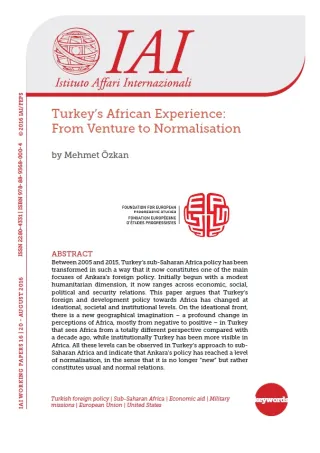 Tra il 2005 e il 2015 la politica sull’Africa subsahariana della Turchia si è trasformata a un punto tale da costituire oggi uno dei principali obiettivi della politica estera di Ankara. Caratterizzata inizialmente da una modesta dimensione umanitaria, tale politica spazia oggi dalle relazioni economiche a quelle sociali, politiche e di sicurezza. Questo saggio afferma che la politica estera e di sviluppo della Turchia verso l’Africa è cambiata a livello concettuale, sociale e istituzionale. Si è affermato infatti in Turchia un nuovo immaginario geografico – con un profondo cambiamento nella percezione dell’Africa, per lo più da negativo a positivo – e l’Africa viene vista da una prospettiva completamente diversa rispetto a un decennio fa, mentre le istituzioni turche sono sempre più presenti in Africa. Da uno studio di tutti questi livelli nell’approccio della Turchia verso l’Africa subsahariana appare evidente come la politica di Ankara abbia raggiunto un livello di normalizzazione, ossia non si presenti più come una “novità” ma piuttosto come una politica di usuali e normali relazioni.