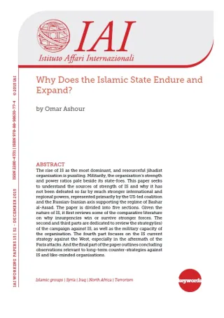 L’ascesa dello Stato islamico come l’organizzazione jihadista dominante e con maggiori risorse è sconcertante. Militarmente, infatti, forza e potere di questa organizzazione sono niente se confrontati a quelli degli stati che le si oppongono. Questo paper cerca di comprendere le origini della forza dello Stato islamico e il motivo per cui non è stato finora sconfitto da potenze internazionali e regionali molto più forti, soprattutto la coalizione guidata dagli Stati Uniti e l’asse russo-iraniana che sostiene il regime di Bashar al-Assad. Il paper è diviso in cinque sezioni: nella prima si procede, data la natura dello Stato islamico, ad un esame degli studi comparati sui motivi per cui le rivolte possono vincere o sopravvivere contro forze preponderanti. La seconda e la terza sezione sono dedicate ad un’analisi della(e) strategia(e) della campagna contro l’organizzazione jihadista, nonché delle capacità militari di quest’ultima. La quarta sezione si concentra sull’attuale strategia contro l’Occidente, soprattutto a seguito degli attentati di Parigi. L’ultima sezione presenta infine alcune osservazioni conclusive relative alle strategie a lungo termine per contrastare lo Stato islamico e organizzazioni simili.
