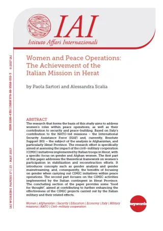 La ricerca su cui si basa questo studio analizza i diversi ruoli delle donne nelle operazioni di pace nonché il loro contributo alla sicurezza e alla costruzione della pace. Basata sul caso-studio del contributo italiano alle missioni a guida Nato (ISAF e l’attuale Resolute Support) l’analisi si concentra sull’Afghanistan, e in particolare sulla provincia di Herat. Obiettivo specifico della ricerca è valutare i risultati delle iniziative di cooperazione civile-militare (CIMIC) realizzate dal contingente italiano a Herat, e in particolare quelle relative alle donne afghane. La prima parte di questo studio presenta il quadro teorico della partecipazione delle donne alle iniziative di stabilizzazione e ricostruzione. Introduce concetti quali l’analisi di genere e la parità di genere (gender mainstreaming) e, quindi, i vantaggi di un focus sul genere per le iniziative CIMIC portate avanti nell’ambito delle operazioni di pace. La seconda parte dello studio è dedicata alle attività CIMIC realizzate dal contingente italiano nella provincia di Herat. Le conclusioni forniscono alcuni spunti volti a contribuire a una maggiore efficacia dei progetti CIMIC realizzati dai militari italiani e a migliorarne ulteriormente i risultati.