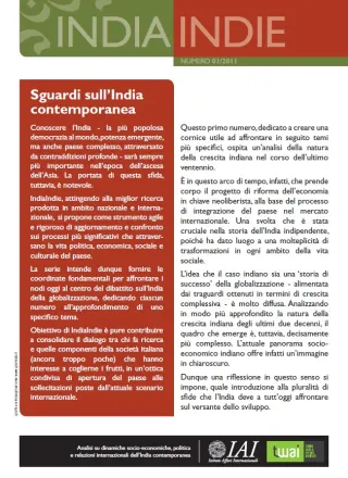 Questo primo numero, dedicato a creare una cornice utile ad affrontare in seguito temi più specifici, ospita un’analisi della natura della crescita indiana nel corso dell’ultimo ventennio. È in questo arco di tempo, infatti, che prende corpo il progetto di riforma dell’economia in chiave neoliberista, alla base del processo di integrazione del paese nel mercato internazionale. Una svolta che è stata cruciale nella storia dell’India indipendente, poiché ha dato luogo a una molteplicità di trasformazioni in ogni ambito della vita sociale. L’idea che il caso indiano sia una ‘storia di successo’ della globalizzazione - alimentata dai traguardi ottenuti in termini di crescita complessiva - è molto diffusa. Analizzando in modo più approfondito la natura della crescita indiana degli ultimi due decenni, il quadro che emerge è, tuttavia, decisamente più complesso. L’attuale panorama socioeconomico indiano offre infatti un’immagine in chiaroscuro. Dunque una riflessione in questo senso si impone, quale introduzione alla pluralità di sfide che l’India deve a tutt’oggi affrontare sul versante dello sviluppo.